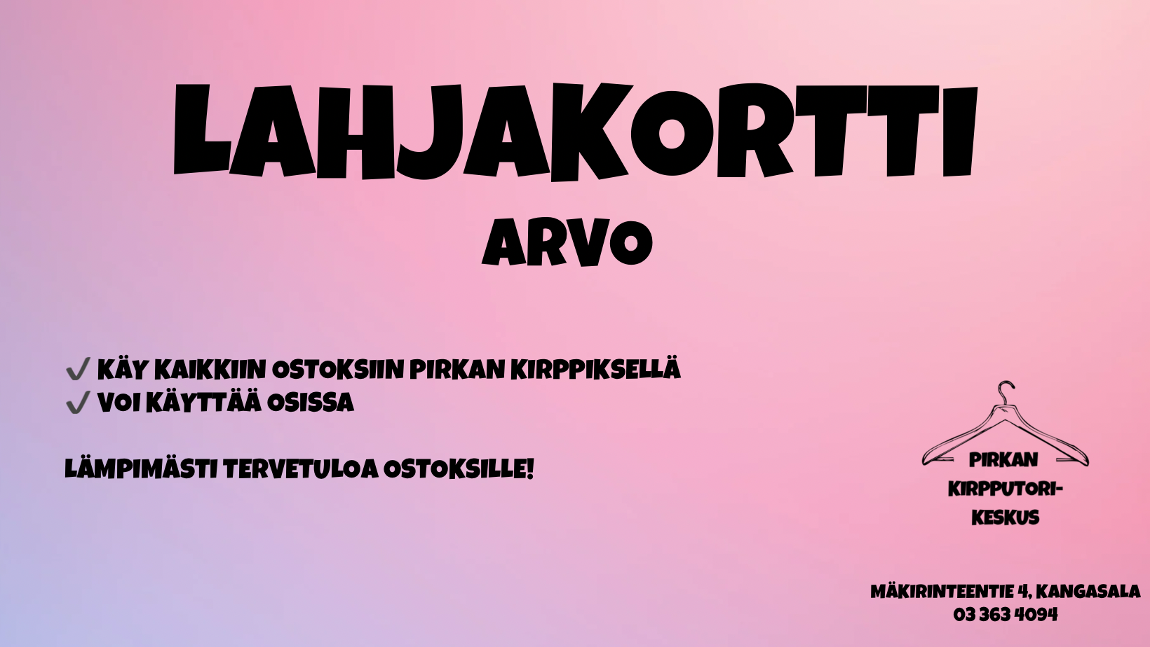 Meiltä voit ostaa liikkeistä lahjakortteja, jotka sopivat täudellisesti lahjaksi! Kortin voi käyttää pöytävuokraan tai ostoksiin ja voit valita haluamasi summan. ♻️ 🩷